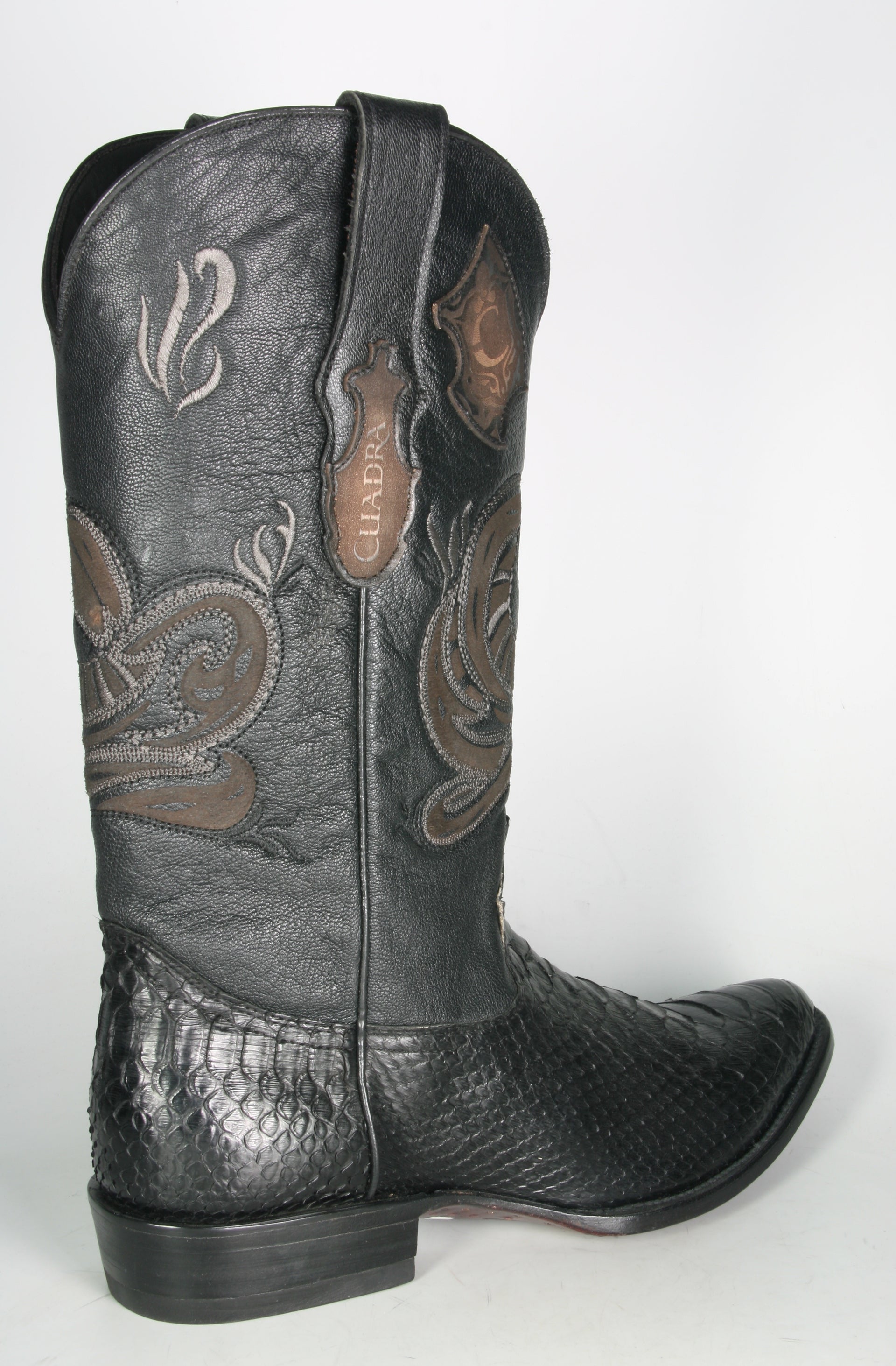 Cuadra Cowboystiefel in runderer Form. Sehr hochwertige mexikanische Handarbeit. Der Fuß ist aus echtem Pythonleder und der Schaft aus Rindsleder. Die Stickung am Schaft stellt eine Schlange dar. Gerade geschnittener Absatz mit ca. 3,5 cm. Schafthöhe ca. 32 cm Farbe: Schwarz