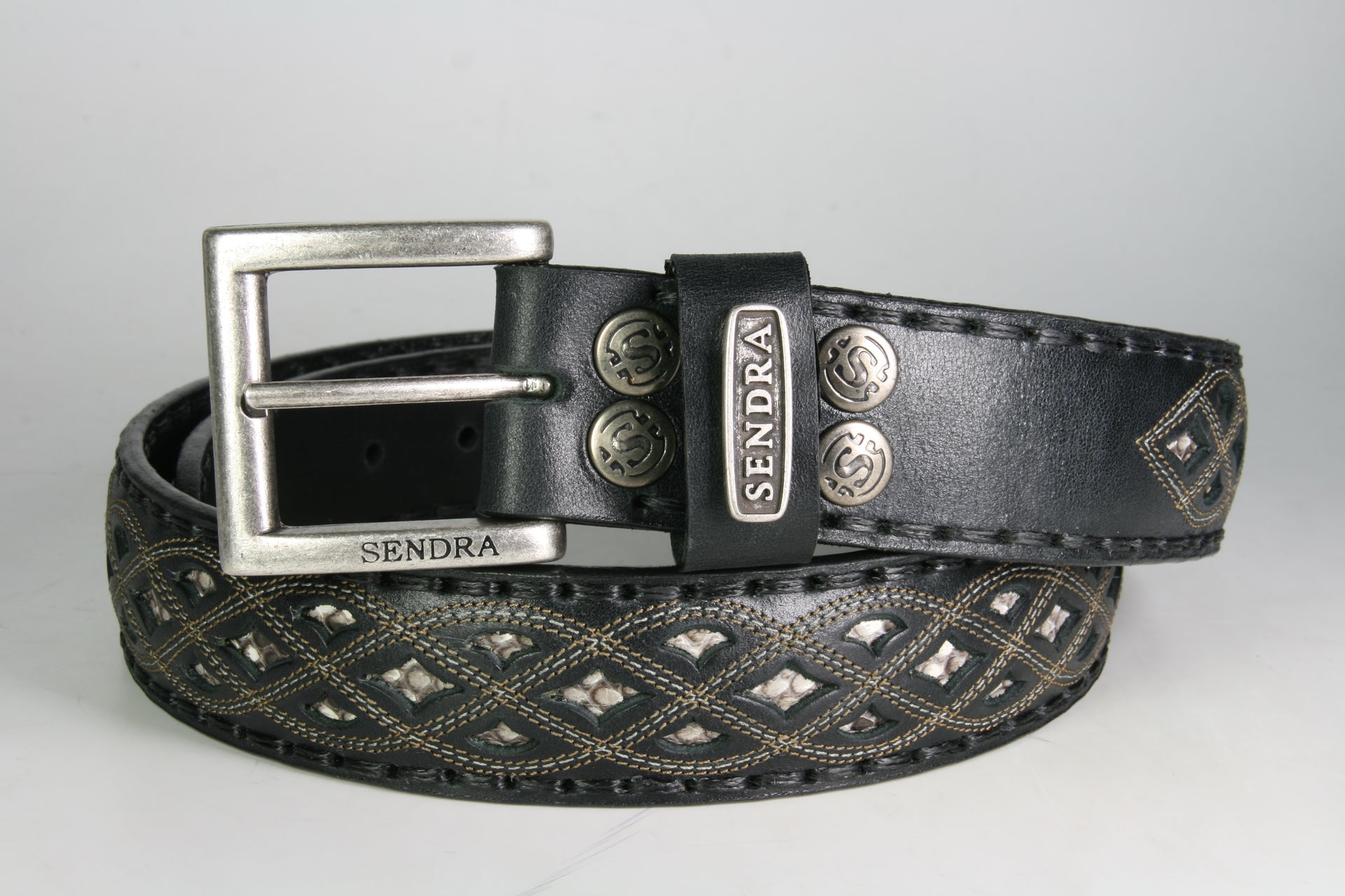 Schwarzer Ledergürtel von Sendra mit unterlegtem, echtem Pythonleder.