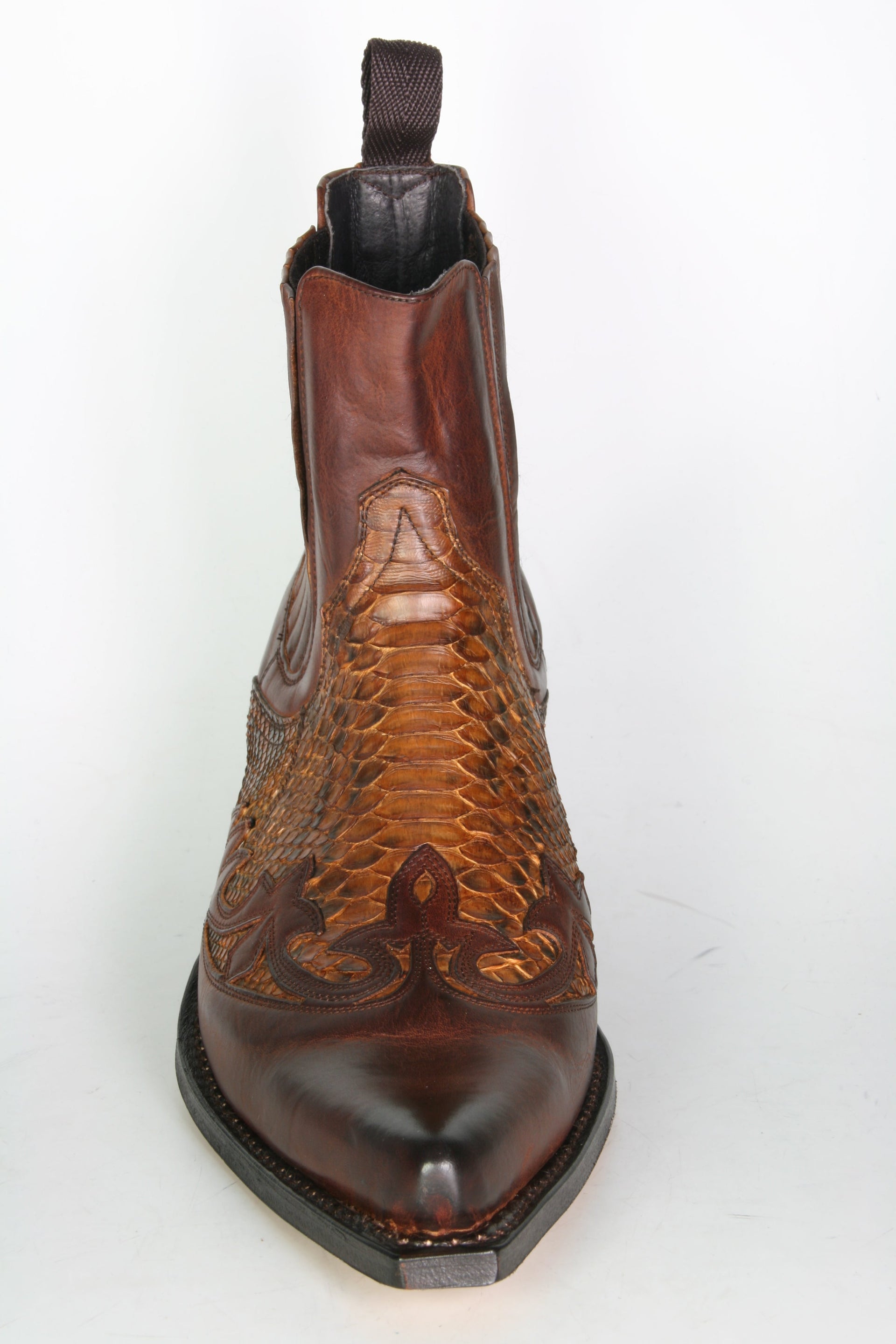 Neues Modell von Sendra. Stiefelette aus braunem, gebrushtem Rindsleder mit echtem Pythonleder.