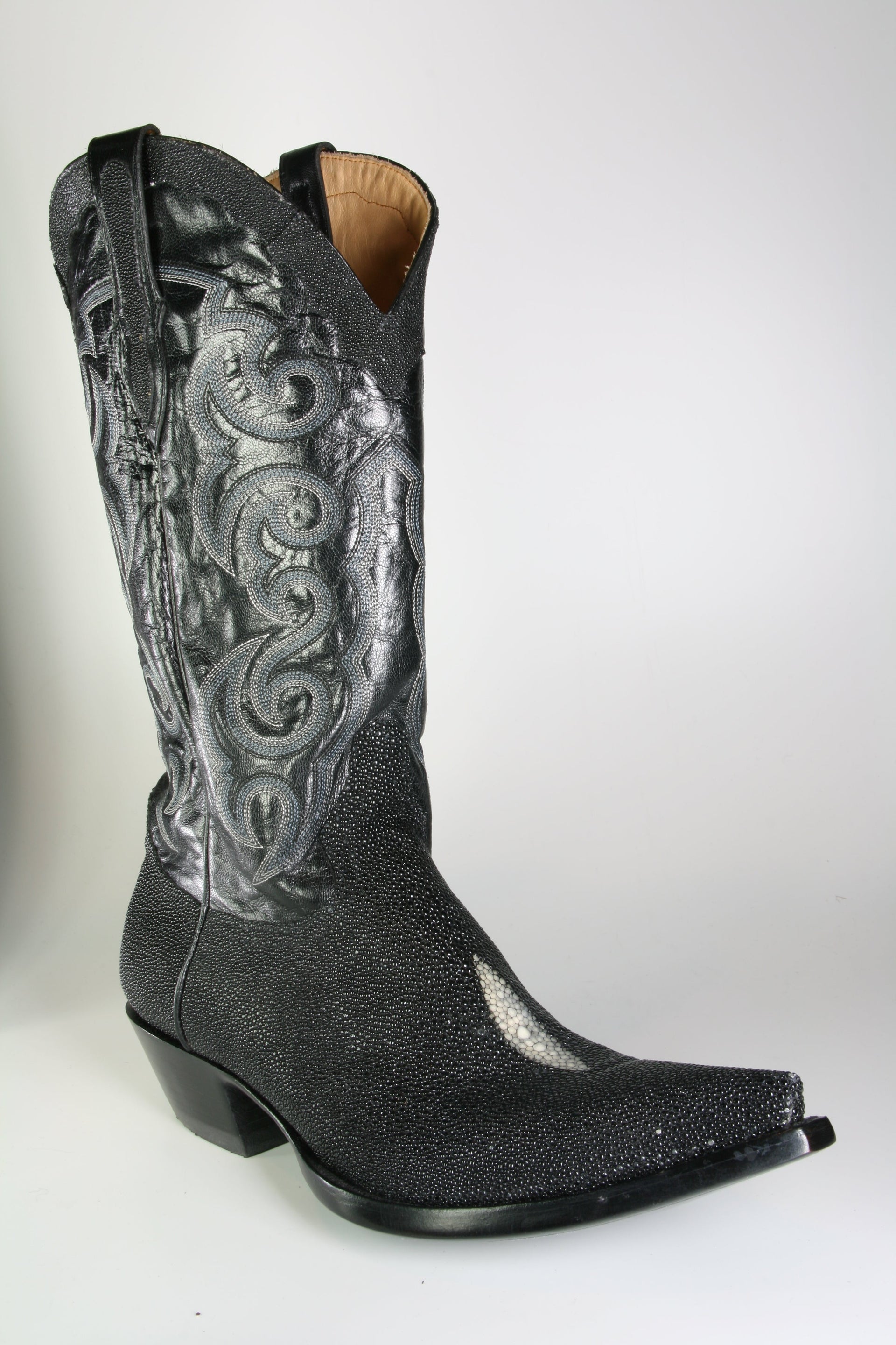 Der Fuß ist aus echtem Mantarochenleder und der Schaft aus Rindsleder. Farbe: schwarz