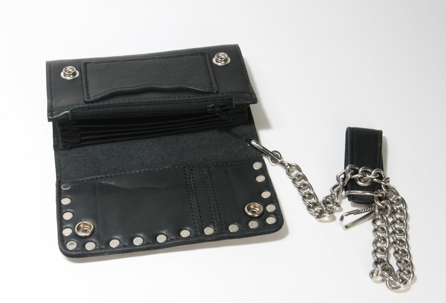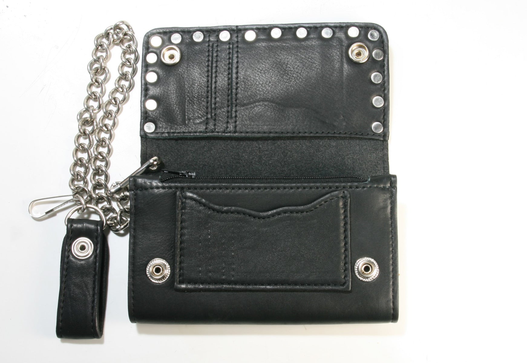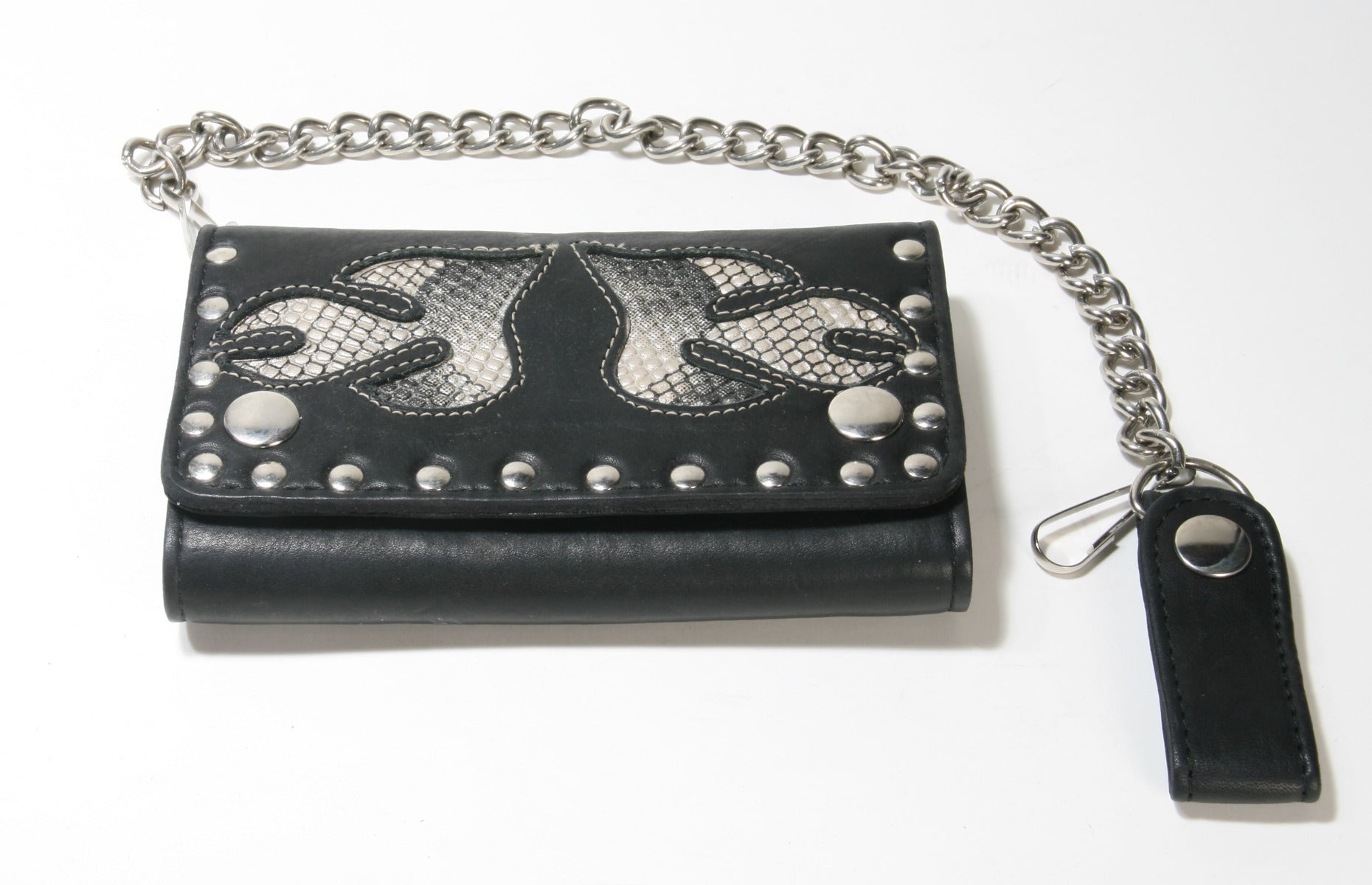 Bikergeldbeutel aus weichem Rindsleder mit abnehmbarer Kette. Die Tribals sind mit Schlangenlederimitation unterlegt.