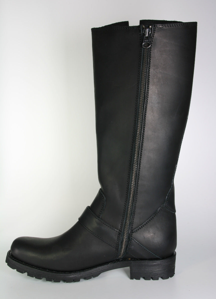 Sancho Bikerboots aus schwarzem Glattleder (Rind). Reißverschluß an der Innenseite zum besseren Einstieg. Außen Reißverschluß und Zierschnallen.
