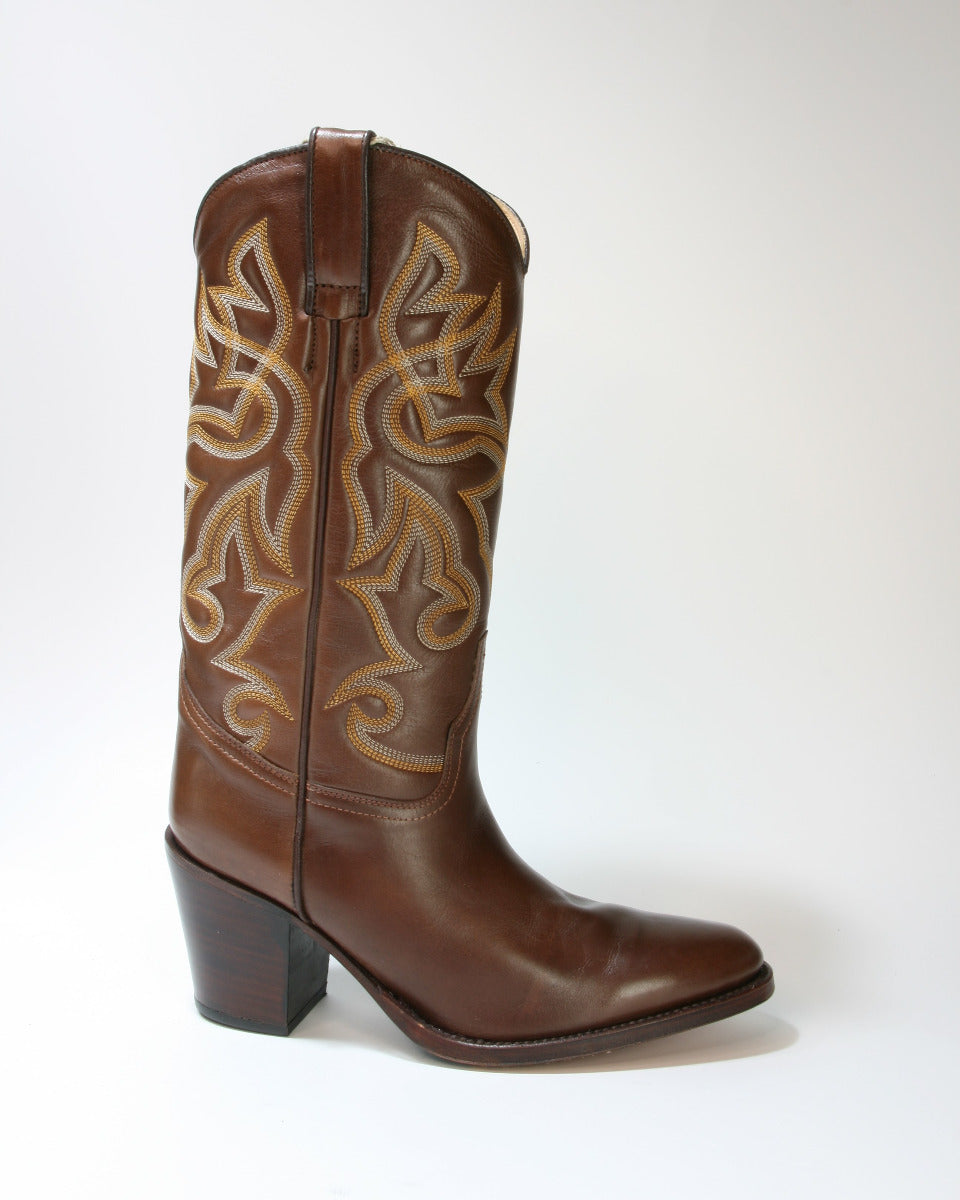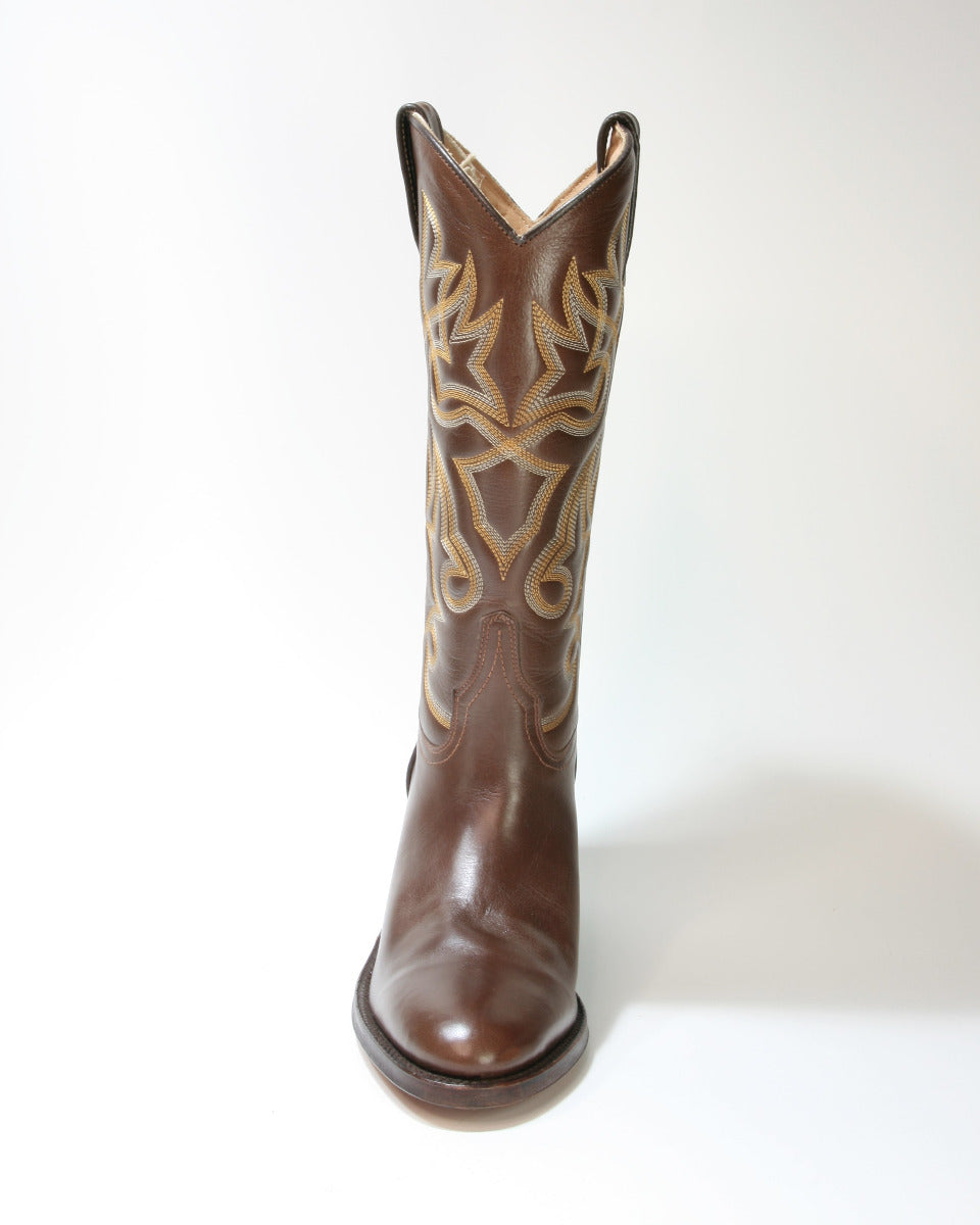 Feminine Cowboystiefel in runder Form. Schönes, braunes Rindsleder mit Stickung am Schaft. Absatzhöhe ca. 7 cm