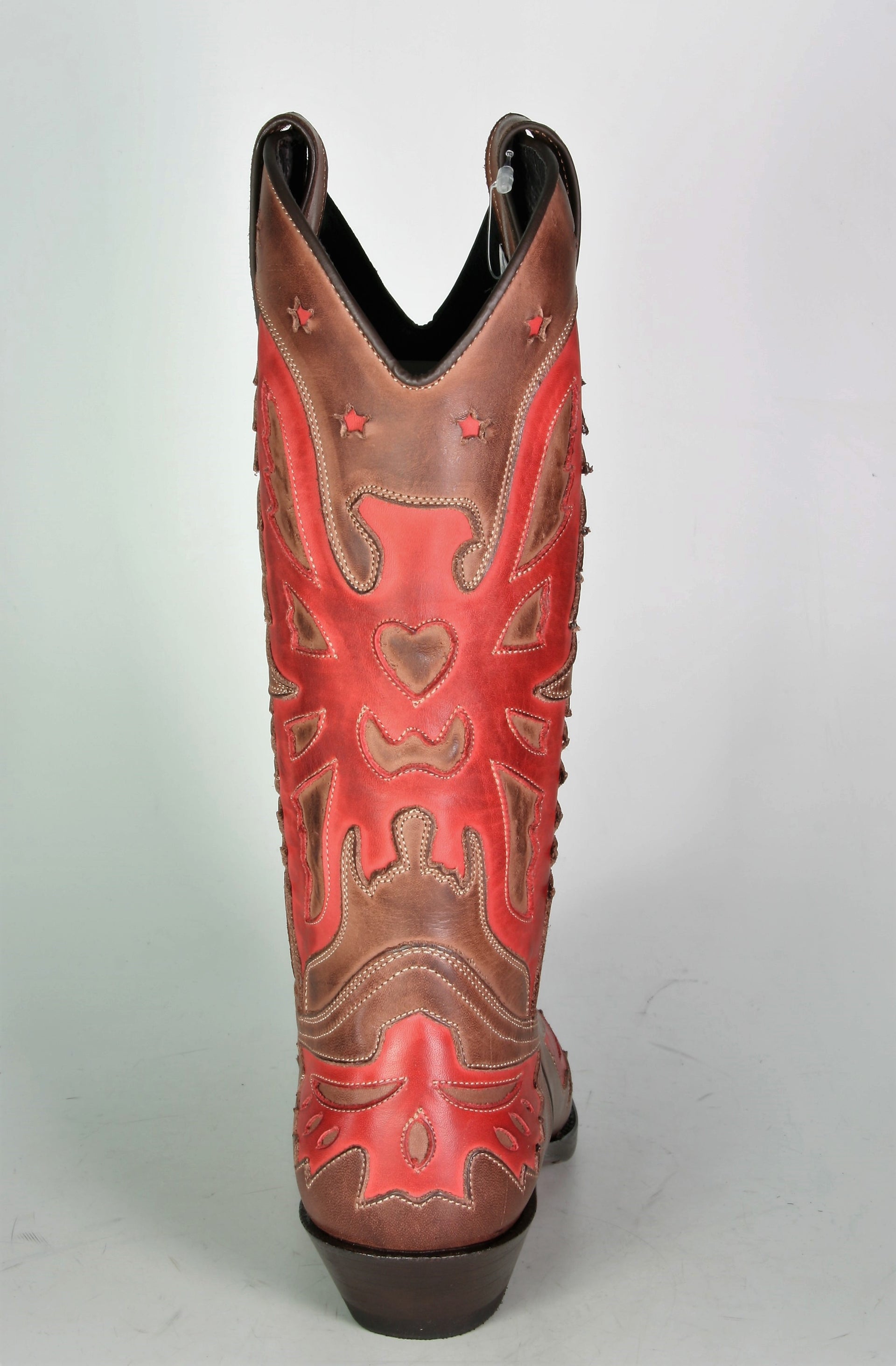 Cowboystiefel von Sancho Abarca aus Rindsleder. Die Applikation am Fuß und Schaft stellt einen Adler dar. Das Rot und Braun sind im Used-Look. Absatzhöhe ca. 4 cm Schafthöhe: ca. 30 cm
