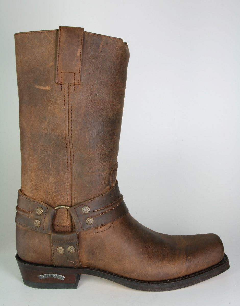 Klassische Bikerboots von Sendra aus braunem Rindsleder. Flacher Absatz und der typische Bikerriemen mit Ring darf nicht fehlen.