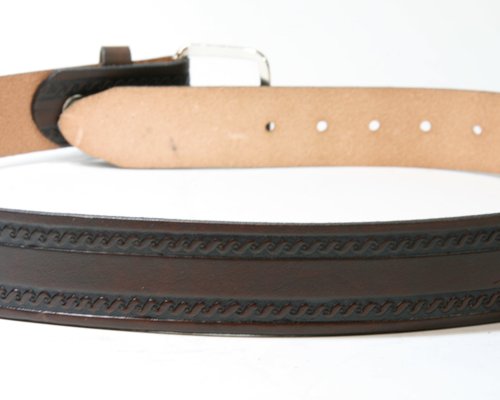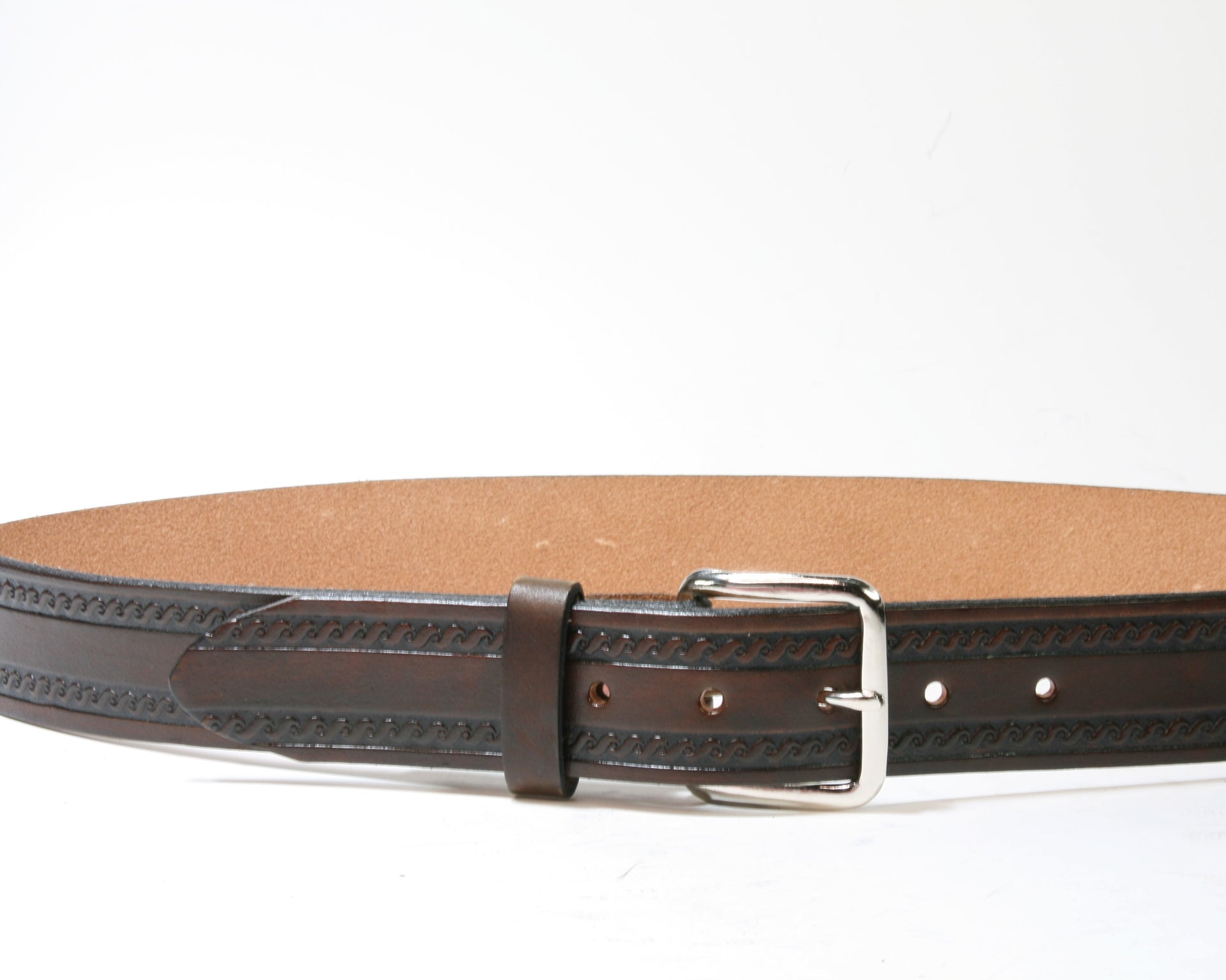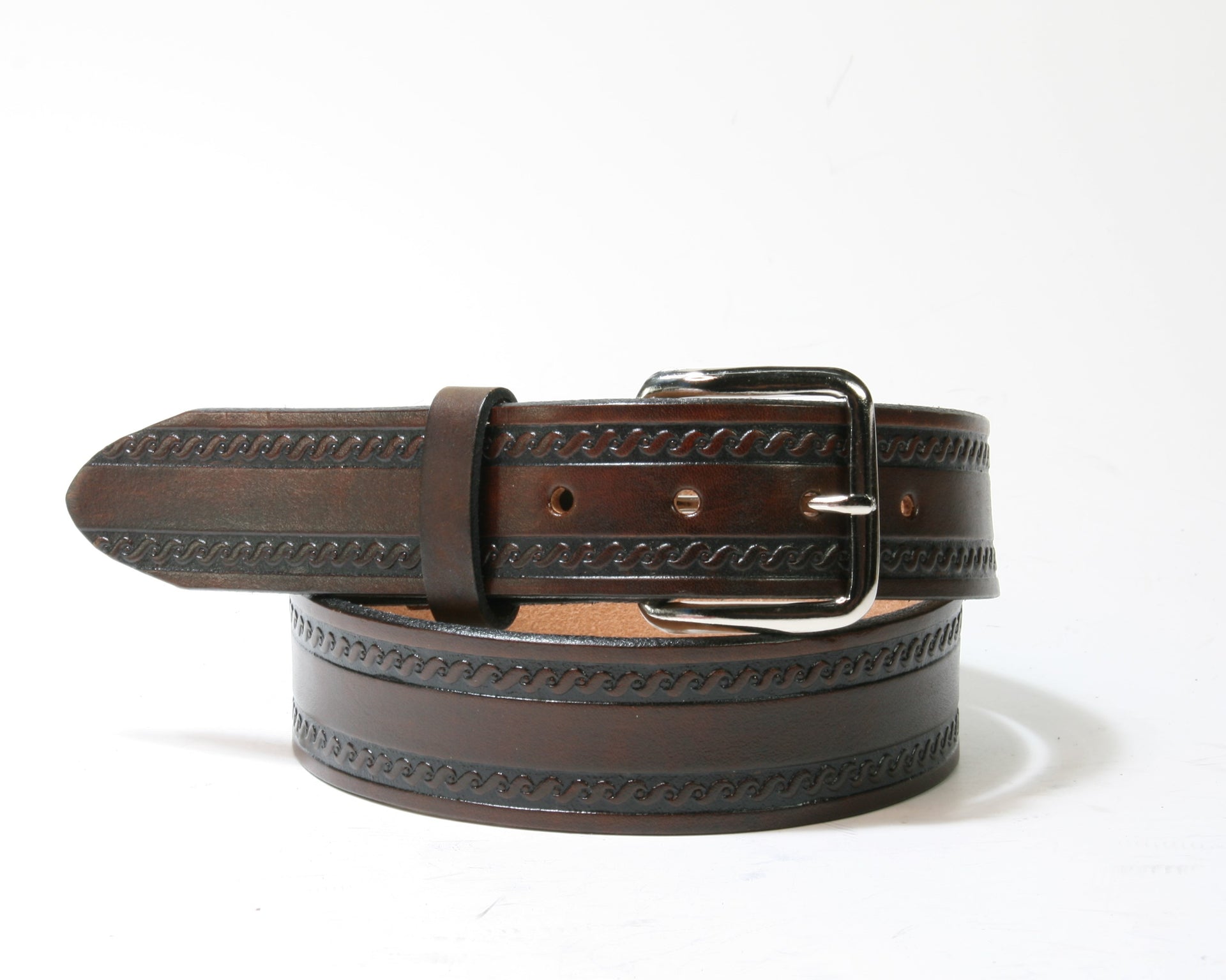 Dunkelbrauner Ledergürtel mit dezenten Verzierungen. Die Schließe kann durch die Druckknöpfe am Gürtel ausgewechselt werden. Die passenden Buckles findest du in der Rubrik ACCESSOIRES.