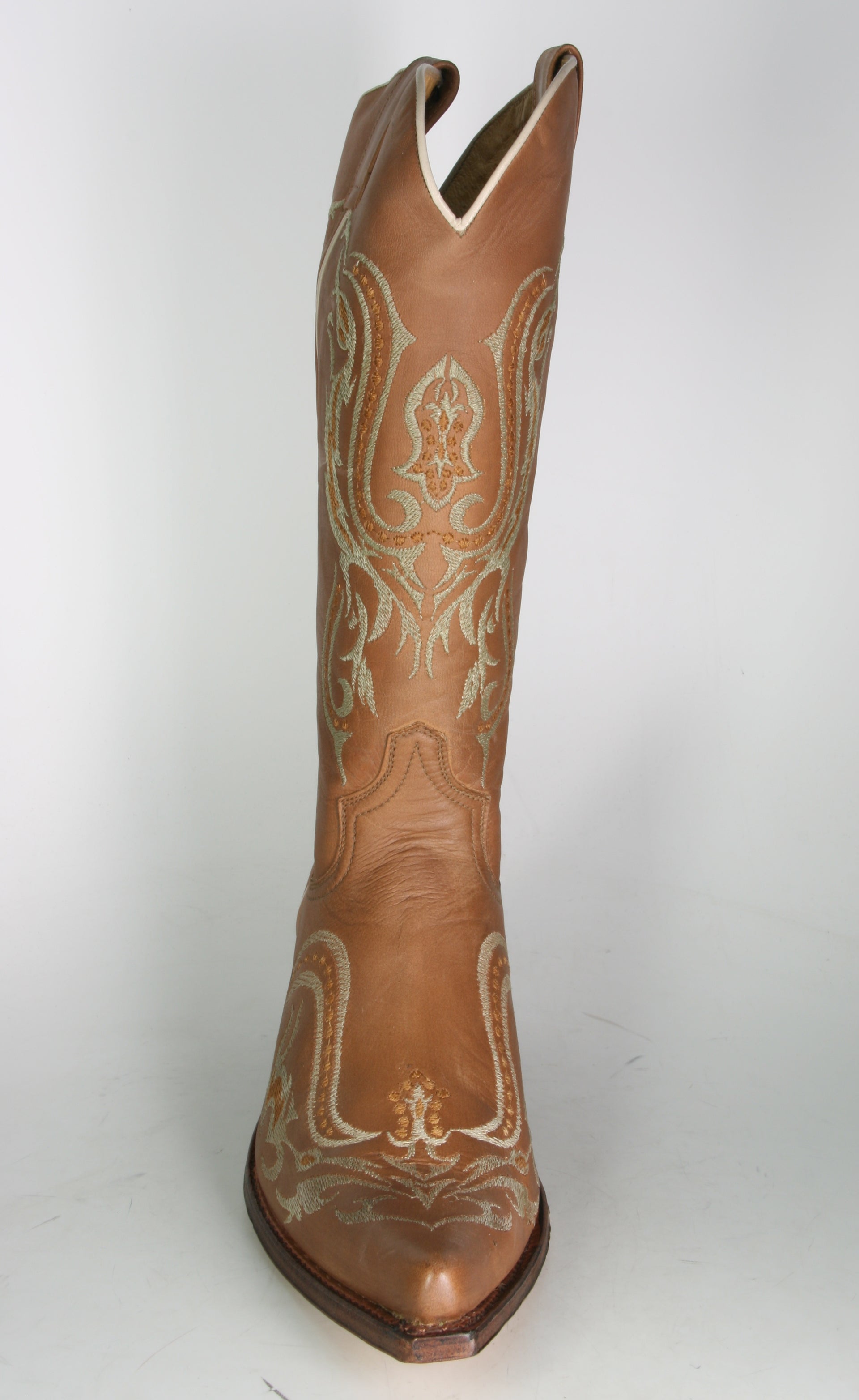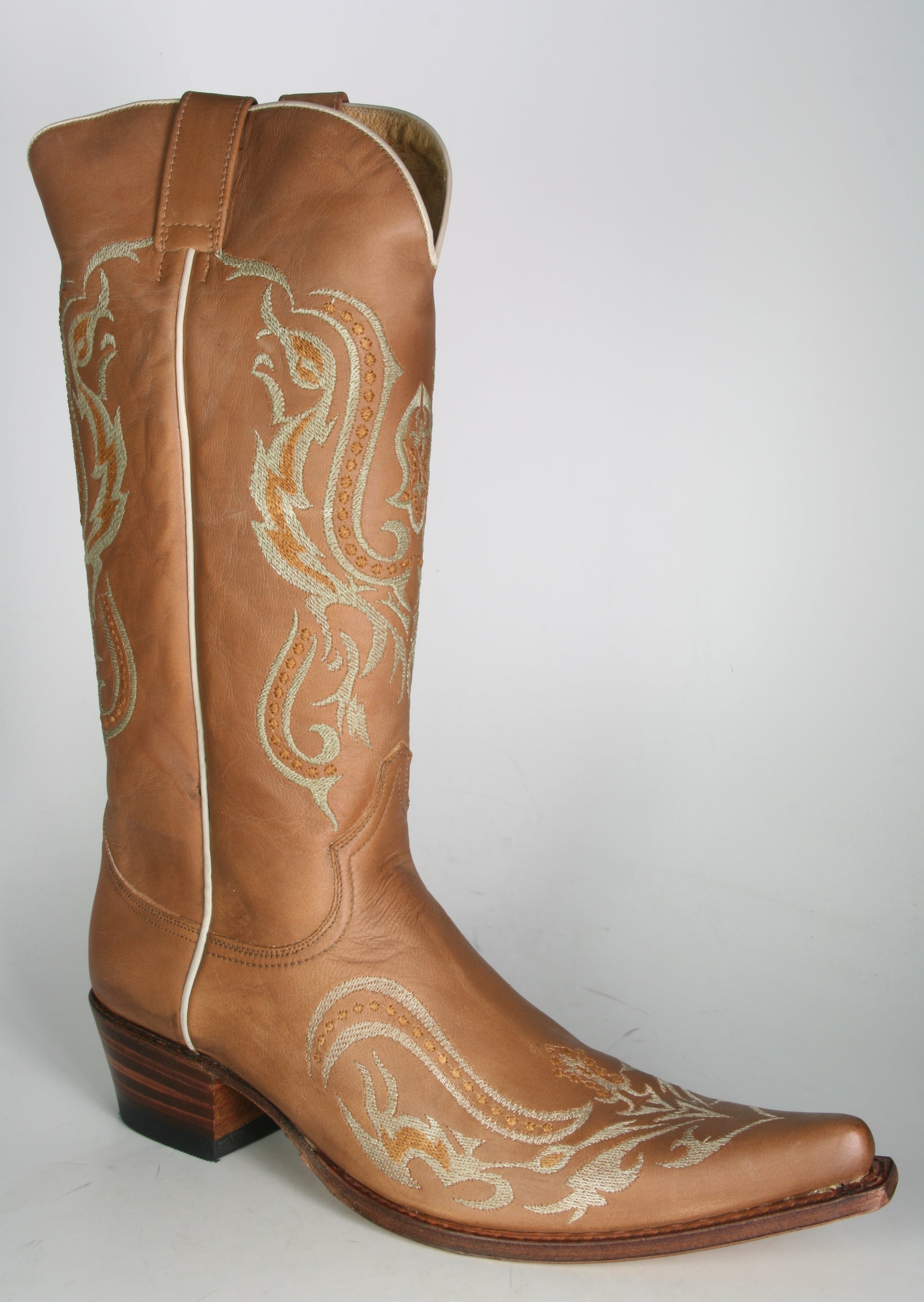 Sendra Cowboystiefel aus hellbraunem Rindsleder mit farblich passender Stickung am Fuß und Schaft. Superbequemer Absatz und durch das weiche Oberleder auch sehr angenehm am Fuß. Der Schaft ist mit 34,5 cm etwas höher als die normalen Cowboystiefel.